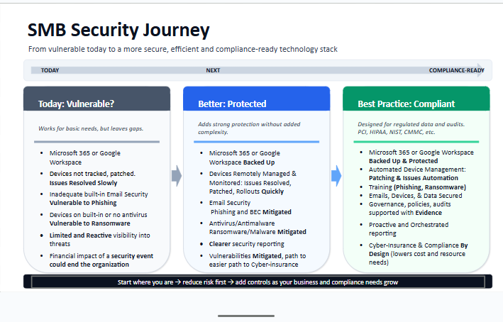 We help Them See the Big Picture and Show Them How to Meet Compliance or Business Needs Efficiently with the Proper Compliance, Security and Technology Stack.